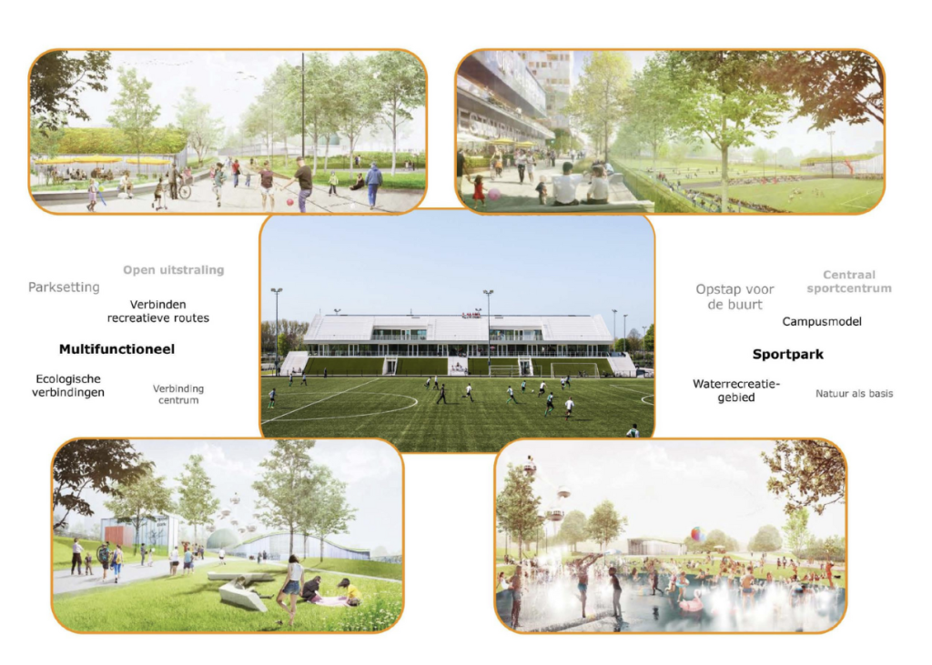 Een multifunctioneel (sport)park met gezamenlijke faciliteiten en horeca paviljoen gelegen in een natuurlijke omgeving